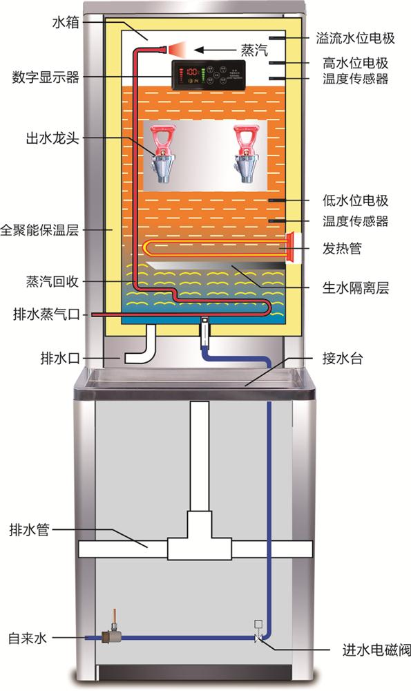 如下图所示,自来水经电磁阀、进水管组件后,再进入水箱底部,当进水达到低水位电极后,马上通电加热,约5分钟可烧开,然后步进进水,逐层烧开。沸腾蒸汽经水箱内下层被冷却成冷凝水排出,同时对底层较冷的水进行了预热,从而达到节能的目的。