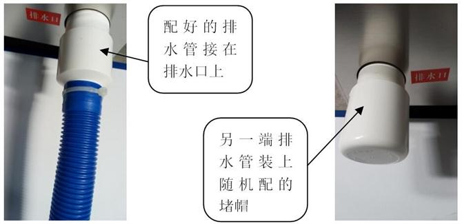 5.6根据实际排水情况,把设备排水软管从左侧或右侧的排水管口连接排水地漏或排水管道,另一端则用排水管堵帽堵上。不要刮破排水软管或把排水软管折住。排水软管与饮水设备排水管口保持平行或低于排水管口,避免管道内产生积水和沉淀物,造成排水不畅或堵塞。
