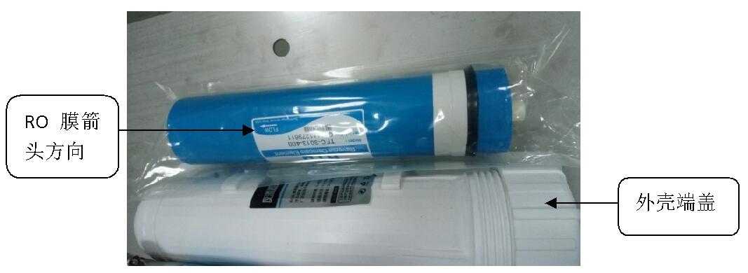 打开膜壳端盖,去除RO膜包装,按图示中箭头方向装入