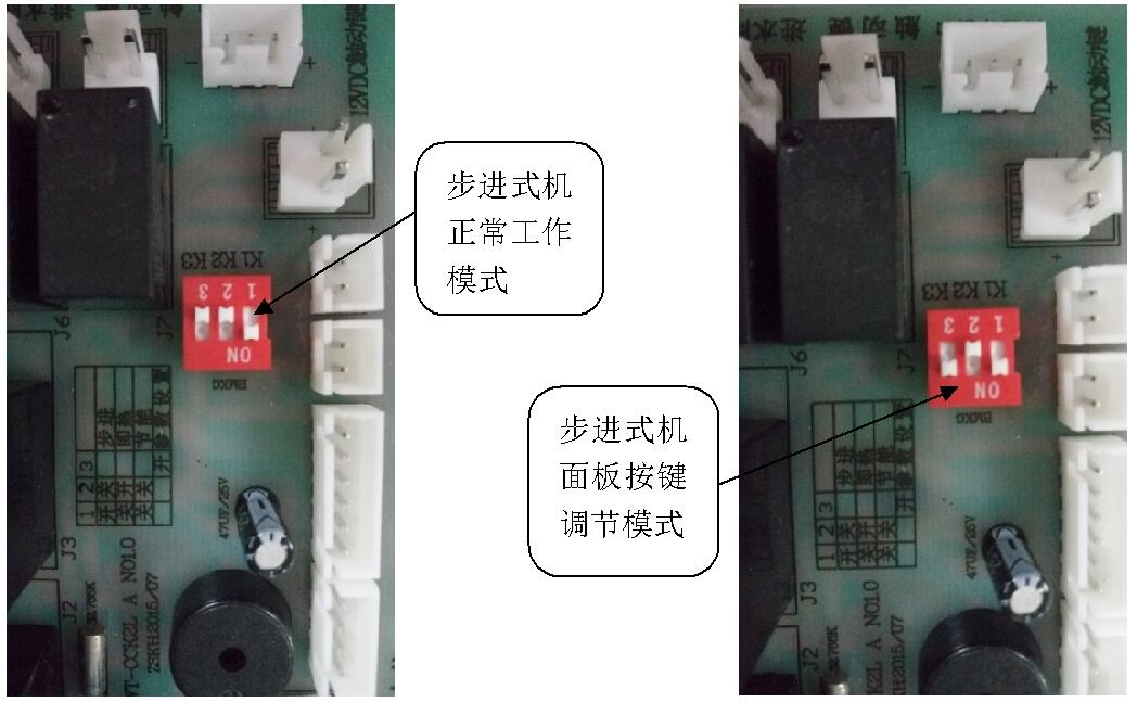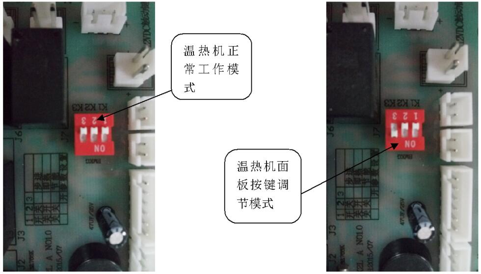 温馨提示:节能温热机正常工作时,电路主板上红色开关为关闭状态,即123号开关均在数字一边,要调节参数,把3号开关拨到“ON”位,参数设置完后必须把3号开关复位。如果选用的工作模式不符,则设备不能正常工作,可把工作模式按要求拨好位置于后关掉电源重启即可。祥情请参阅【使用说明书】