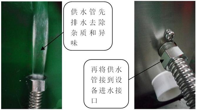 5.4 打开要与饮水设备连接的自来水管道阀门,先排掉一部分的水,如果是新安装的管道需排到流出来的水无异味和杂质为止,然后从配件箱中取出波纹管连接自来水管道与饮水设备进水口(有标示)。如配置的管道长度不够则需另拿合适长度的波纹管或金属软管连接。